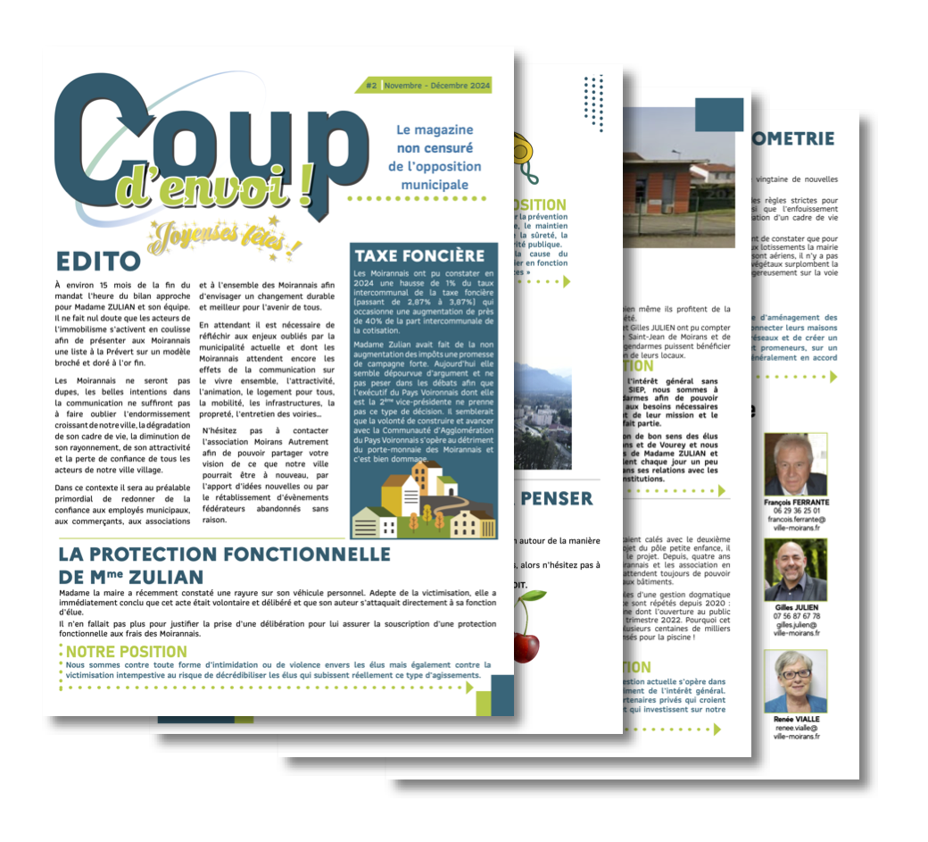 Nous avons le plaisir de vous présenter « Coup d’envoi » votre nouveau magazine non censuré de l’opposition municipale de la ville de Moirans.